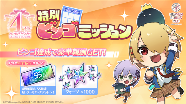 ヘブンバーンズレッド 4th Anniversaryを記念して、「ヘブバン 4th Anniversary 特別ビンゴミッション」を実施する。すべてのミッションを達成すると「4周年記念 SS確定セレクトガチャチケット」やクォーツ1,000個などの豪華アイテムが獲得できる。