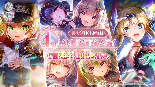 ライトフライヤースタジオとKeyは、『ヘブンバーンズレッド』において、2⽉1⽇22:00から「4th Anniversaryキャンペーン」を開始することを発表した。最⼤200連無料の毎⽇無料10連ガチャや、好きなSS1体をえらべる豪華報酬が獲得できる特別ビンゴミッションを開催!また、4周年記念ストーリーイベント「メインストーリー過去編 Communication Breakdown」や、新⾐装のSS<レゾナンス>七瀬七海が登場する「期間限定4th Anniversaryガチャ」も開催する。さらに、セラフ部隊司令官「⼿塚咲」のプレイアブル実装