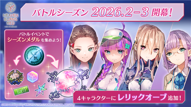 バトルシーズン 2026.2-3では、樋⼝聖華、⽩河ユイナ、伊達朱⾥、⼤島⼆以奈の4キャラクター、そしてさらに特別枠として七瀬七海を加えた5キャラクターのレリックオーブが交換できる。また本シーズンより、シーズンメダル交換所に新アイテム「追憶の鍵」を追加!あわせてシーズンメダル交換所の⼀部内容の調整を実施した。新アイテム「追憶の鍵」は⼀回のシーズン交換所から最⼤3個まで獲得できる。「ホーム設定」で使⽤することで、メインストーリーやイベントストーリーのギャラリーの⼀部をホーム画⾯に設定可能に!