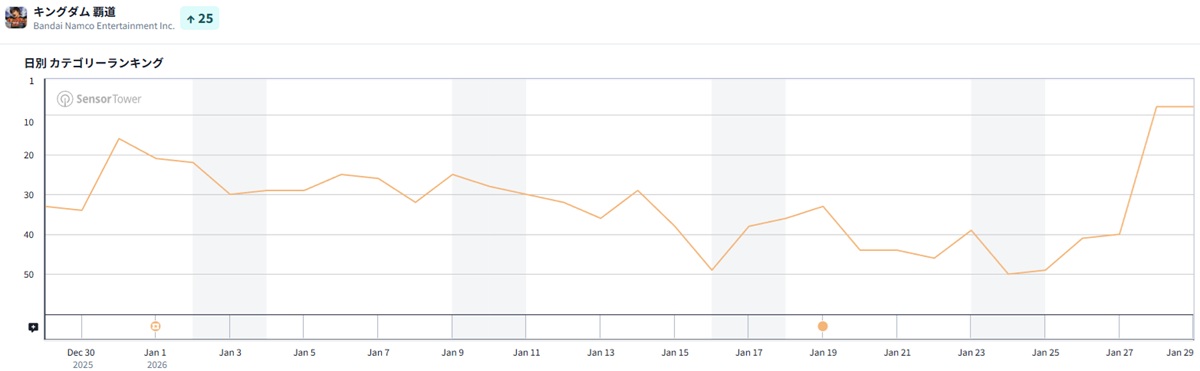 そうした中、バンダイナムコエンターテインメントの『キングダム 覇道』が32ランクアップでトップ10圏内に入った。『キングダム 覇道』は、1月28日にゲーム内の累計“将軍数(全サーバーのプレイヤーデータ数の累計)”が100万人を突破したことを発表。これを記念して「特別登用札・SSR」と「英傑登用札×20」をプレゼントしている。