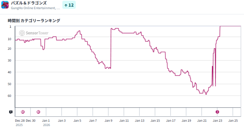 | 1 | 12 | ↑11 | パズル&ドラゴンズ | ガンホー<3765> |