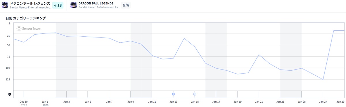 | 18 | 126 | ↑108 | ドラゴンボール レジェンズ | バンダイナムコエンターテインメント<7832> |