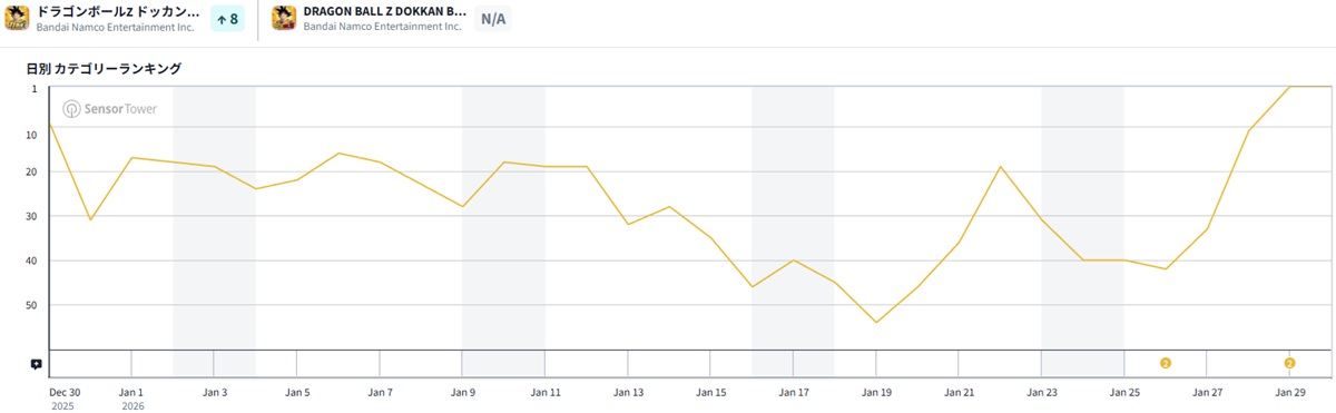 1月30日9時現在のApp Storeセールスランキング(ゲームカテゴリー)は、バンダイナムコエンターテインメントの『ドラゴンボールZ ドッカンバトル』が10ランクアップでトップに躍り出た。