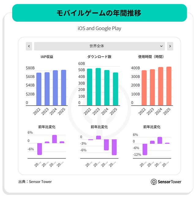 モバイルは2025年にすべての主要指標で記録的な高水準に達し、生成AIと拡大するマネタイズの機会によって促進された。Sensor Towerの2026年版モバイル市場年鑑によると、ダウンロード数、IAP収益、使用時間がそれぞれ過去最高を記録したことを示している。特に世界IAP収益は前年比+10.6%の1670億ドルに達し、市場がいかに明確にマネタイズへとシフトしたかを浮き彫りにしている。
