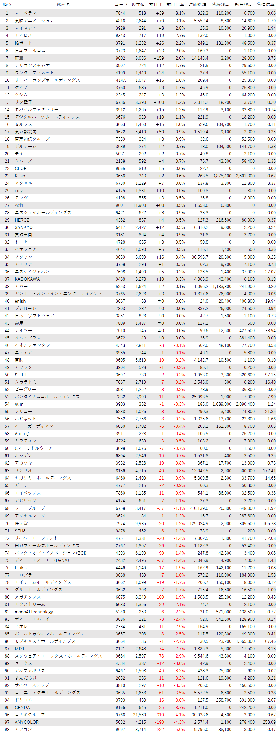 モバイルゲーム系の銘柄は、ガンホー<3765>、ケイブ<3760>、モバイルファクトリー<3912>が高く、サイバーエージェント<4751>、MIXI<2121>、DeNA<2432>、グリーHD<3632>、アカツキ<3932>、コロプラ<3668>が安い。