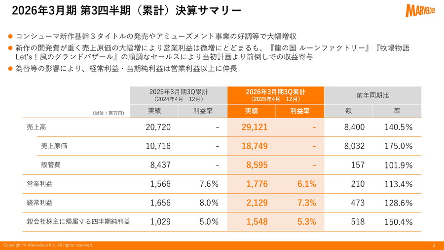 マーベラス<7844>は、2026年3月期 第3四半期累計の決算説明動画を公開し、コンシューマ向け新作タイトルの発売やアミューズメント事業の好調を背景に大幅な増収を達成した。利益面では、新作基幹タイトルの開発費増加をこなして、2桁の営業利益の伸びを達成した。