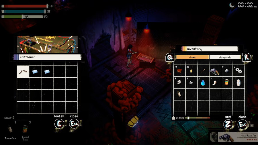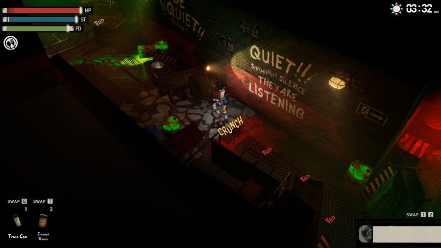 ダイナミックな昼夜サイクルがあり、日中は探索や物資の調達、準備に費やし、夜になると悪夢が訪れ、より多くの敵が出現し、懐中電灯だけでは移動が困難になる。最善の策は、シェルターを見つけて朝まで身を潜めることである。