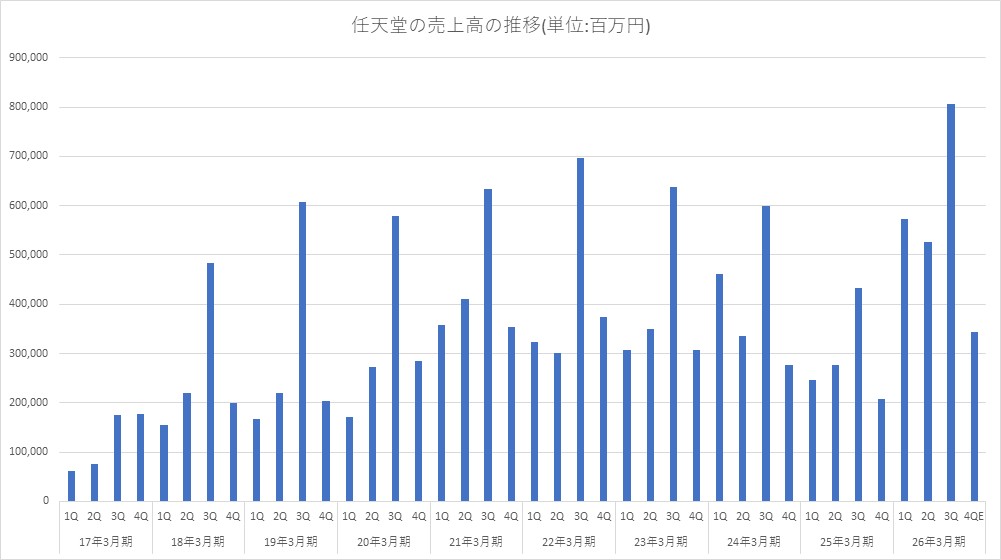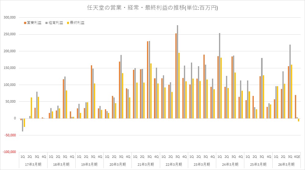 任天堂<7974>は、2月3日、2026年3月期 第3四半期の連結決算を発表し、売上高1兆9058億8300万円(前年同期比99.3%増)、営業利益3003億9300万円(同21.3%増)、経常利益4558億4200万円(同39.4%増)、最終利益3588億6300万円(同51.3%増)だった。