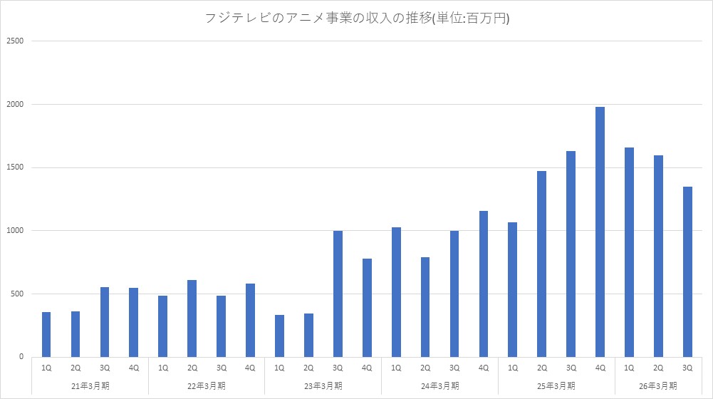 ただ、四半期別に見ると、少し印象が変わる。四半期別の売上高の推移は以下の通りだが、右肩上がりだったアニメ事業の収入は、25年3月期 第4四半期をピークにして下落傾向にあるように見受けられる。