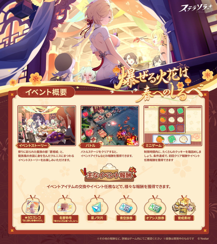 Yostarは、スマートフォン/PC(Windows)向けゲーム『ステラソラ』において、2月3日メンテナンス後より期間限定イベント「爆ぜる火花は春へのしるべ」を開催することを発表した。あわせて、★5 新巡遊者「クルニス(華服)」が先行実装で登場するピックアッププガチャ開催なども実施する。