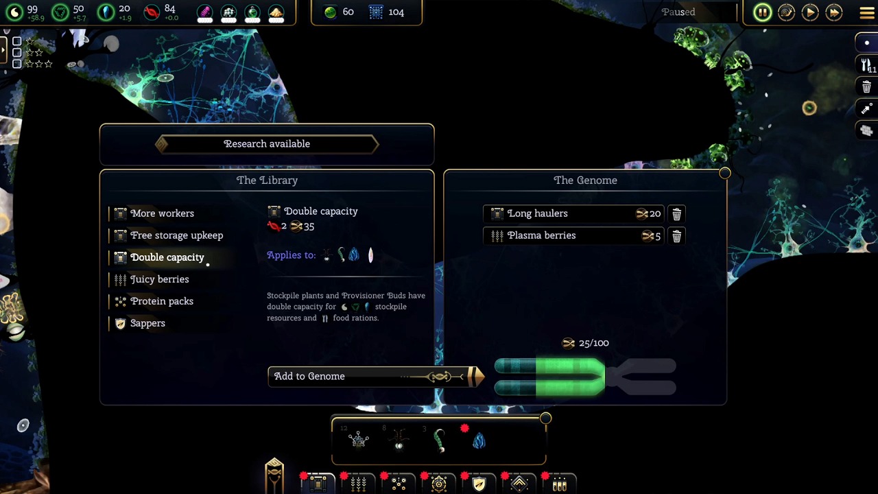 本作では、幹細胞を起点に多様な植物や生物を育成し、生態系そのものを設計していく。資源の生産・消費バランスや配置場所、周囲の環境条件がコロニーの成長に直結。防衛を固めるか、拡張を優先するかなど、常に戦略的判断が求められる。