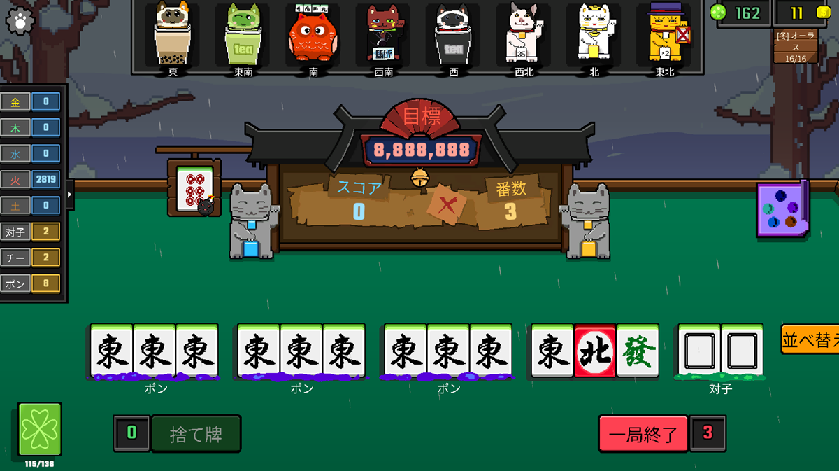 手牌の組み合わせだけでなく、宝物の配置や方位の選択が局全体の運勢に影響し、一手ごとの判断が結果を大きく左右する設計となっている。