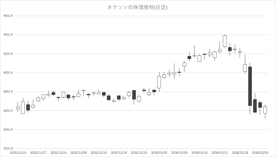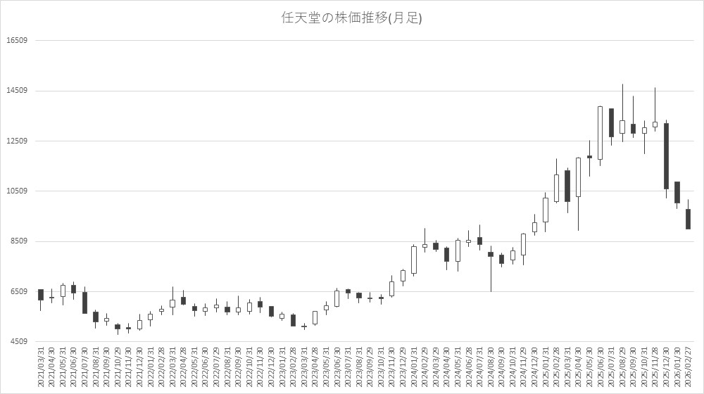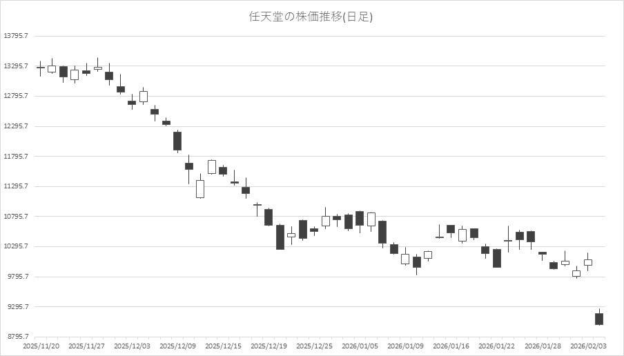 大手ゲーム関連を見ると、任天堂<7974>が大幅安。前日に第3四半期の決算発表で26年3月期の業績見通しを据え置いたことで失望売りを誘った。ソニーG<6758>、バンダイナムコHD<7832>、セガサミーHD<6460>、コナミG<9766>、スクエニHD<9684>、カプコン<9697>、コーエーテクモHD<3635>など大手ゲーム全体に波及した格好もようだ。任天堂の月足でみると、急ピッチの調整が進んでおり、テクニカル的には75ヶ月移動平均線である8000円前後が当面の下値目処として意識されるかもしれない。