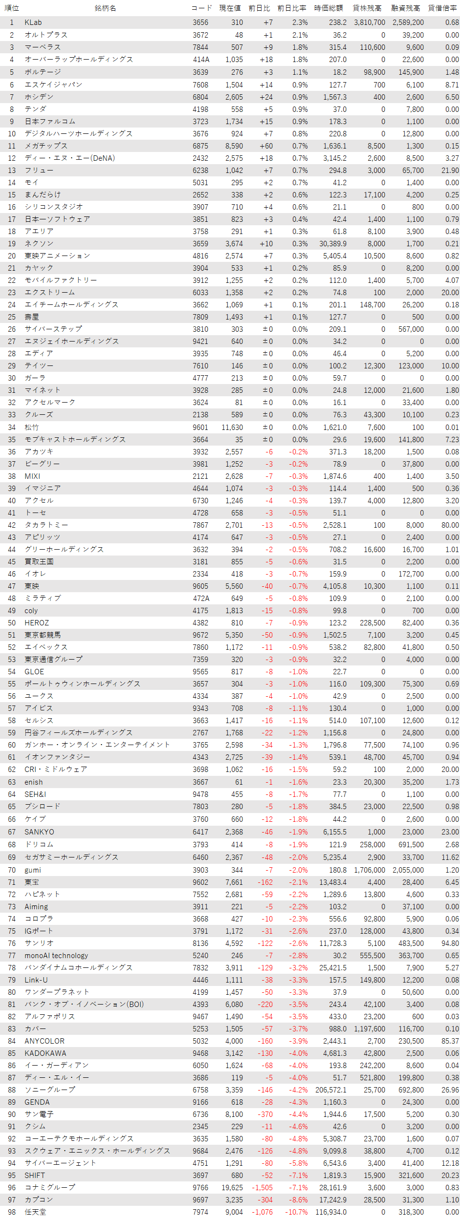 こうしたなか、ゲーム・エンタメ関連企業をみると、登録されている98銘柄のうち、上昇は25銘柄(26%)、下落は63銘柄(64%)、変わらずは10銘柄(10%)で、売り優勢だった。