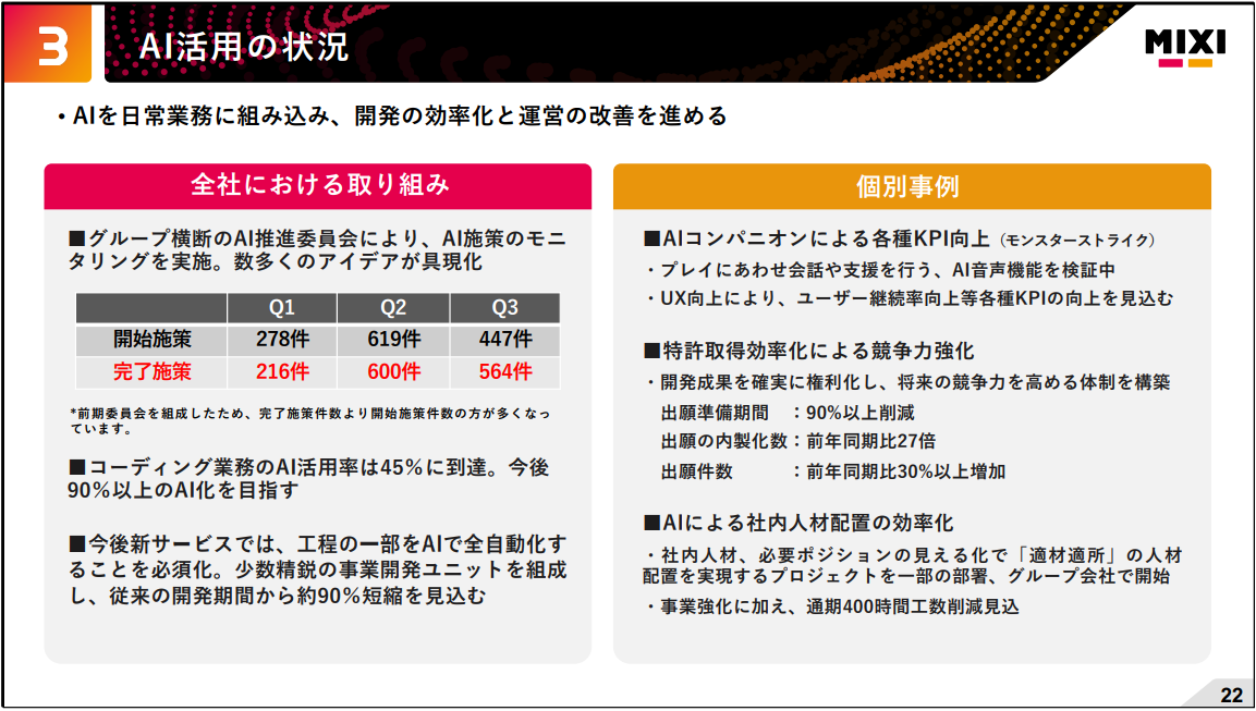 MIXIグループではAI活用を経営テーマの一つに据え、今期は1300件以上の施策を完了した。開発現場ではコーディング業務のAI活用率が45%に達しており、将来的には90%超を目標とする。一部プロジェクトでは少数精鋭体制により、開発期間を約90%短縮する成果も出ている。サービスへの応用については、『モンスターストライク』では「AIコンパニオン」機能の開発が進行中で、ユーザー体験向上への活用を目指す。