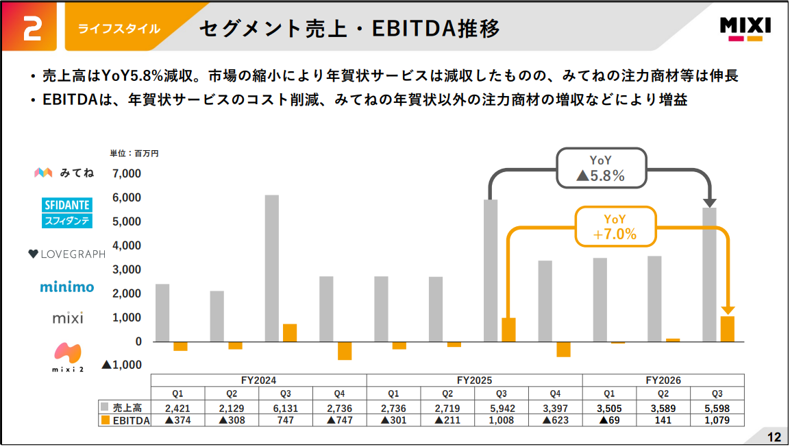 ライフスタイルセグメントの売上高は同5.8%減の55億円だった。市場縮小を背景に年賀状サービスが減収となった。一方、EBITDAはコスト削減と『家族アルバム みてね』における注力商材の成長により、同7%増の10億円と改善した。