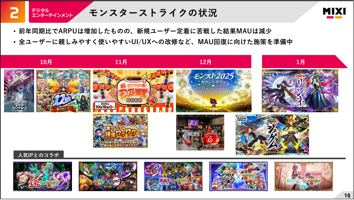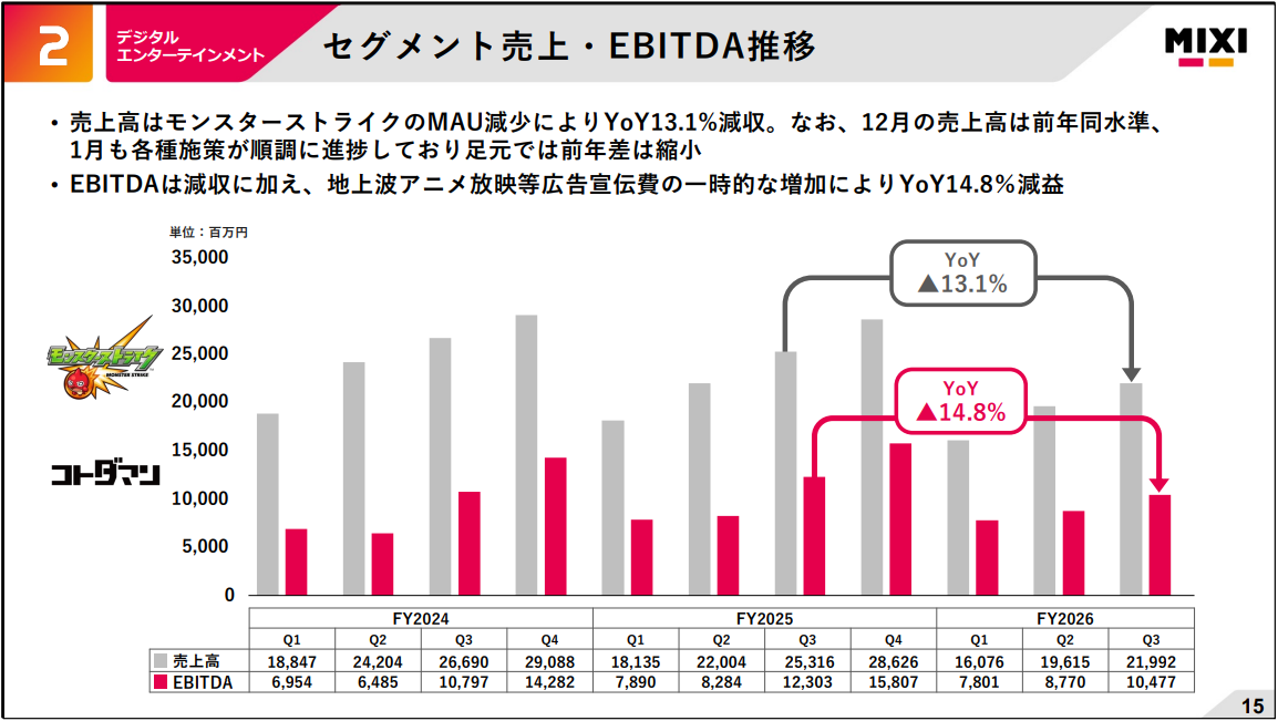 デジタルエンターテインメントセグメントの売上高は、主力タイトル『モンスターストライク』のMAU減少が影響し、同13.1%減の219億円だった。EBITDAも減収と、地上波アニメ放映に伴う一時的な広告宣伝費増加により、14.8%減の104億円となった。