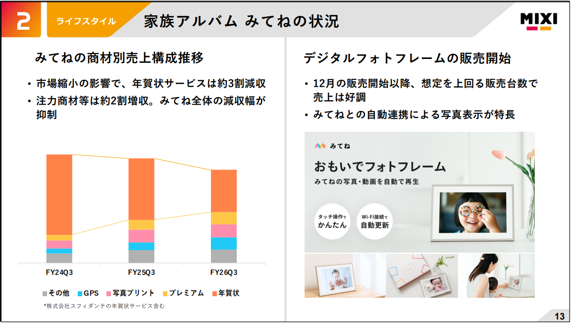 『みてね』では、年賀状関連が3割減収となる一方、注力商材は2割増収。12月から販売を開始したデジタルフォトフレームも想定を上回る販売台数で推移している。