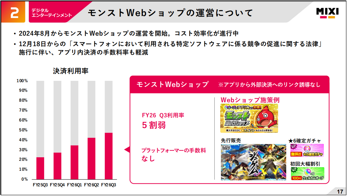 また、アプリ外決済チャネルである『モンストWebショップ』の利用率は約5割まで拡大したことも注目される。キャラクター先行販売やセール施策が好評で、今後も利用拡大を進めていく方針だ。