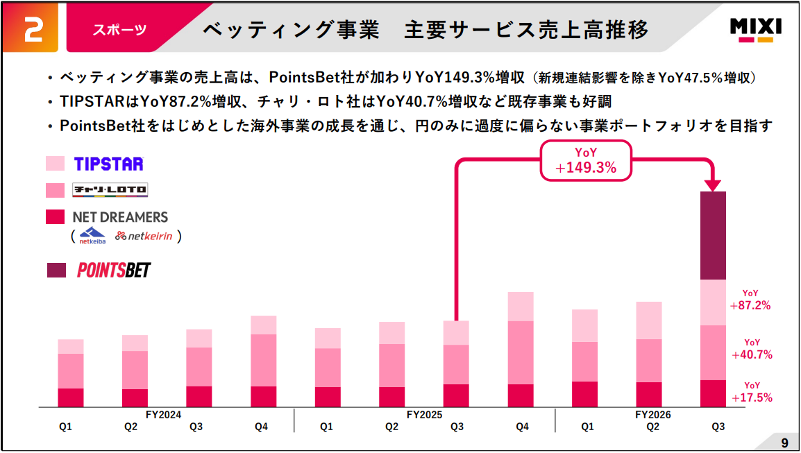 ベッティング事業全体の売上高は同149.3%増と高成長を記録。PointsBet社を除く既存事業でも47.5%増と、M&A効果にとどまらない成長が確認された。