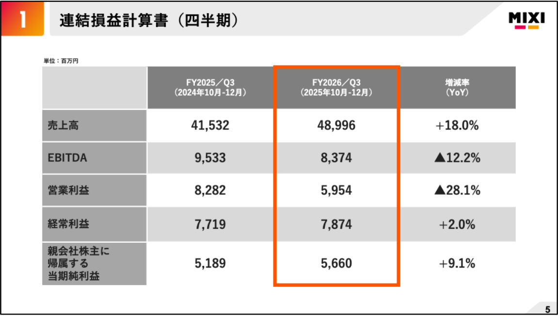 MIXI<2121>は、2026年3月期 第3四半期(2025年10~12月)の決算説明会を開催し、スポーツ事業の拡大を背景に増収を確保した一方、デジタルエンターテインメント事業の減収が利益面に影響したことを明らかにした。