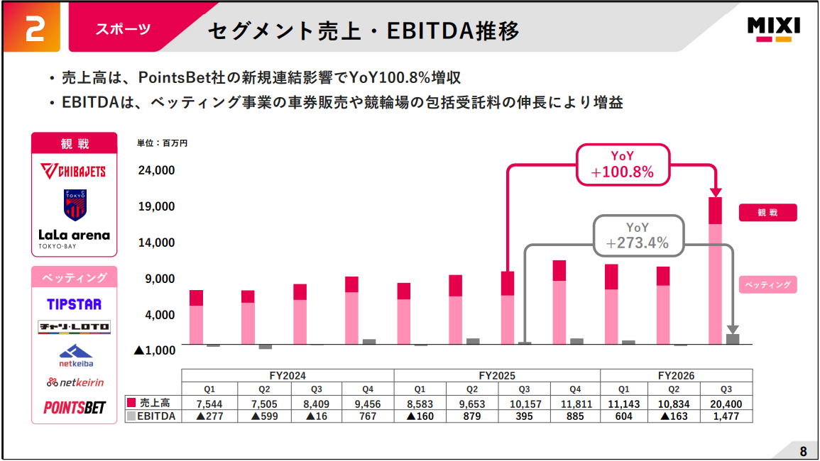 スポーツセグメントの売上高は同100.8%増の204億円と大幅に拡大。PointsBet社の新規連結に加え、国内事業の好調が寄与した。EBITDAは同273.4%増の14億円と急伸。前四半期比での大幅な改善については、前期に計上された買収関連の一時費用(約8億円)の剥落が要因としている。