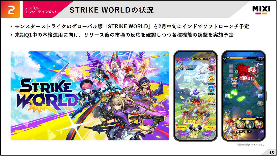 また、『モンスト』のグローバル版にあたる『STRIKE WORLD』は、2月中旬にインドでソフトローンチを予定しており、来期2027年3月期 第1四半期の本格稼働を見据える。