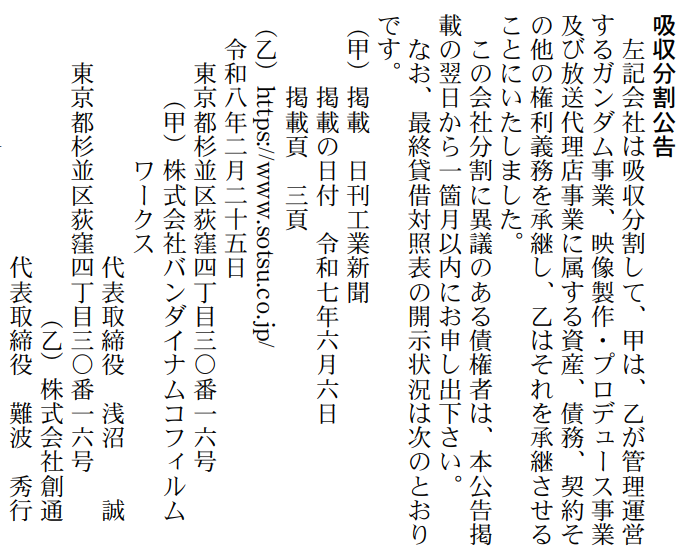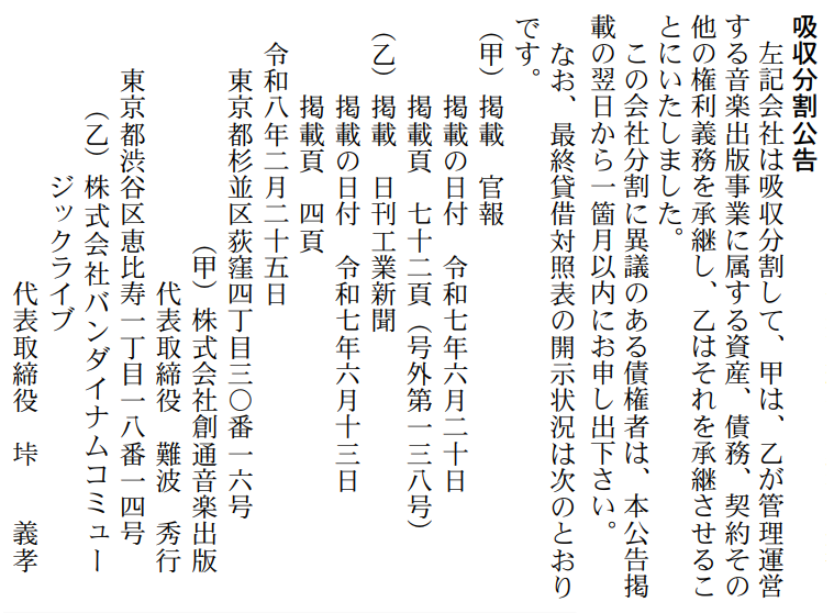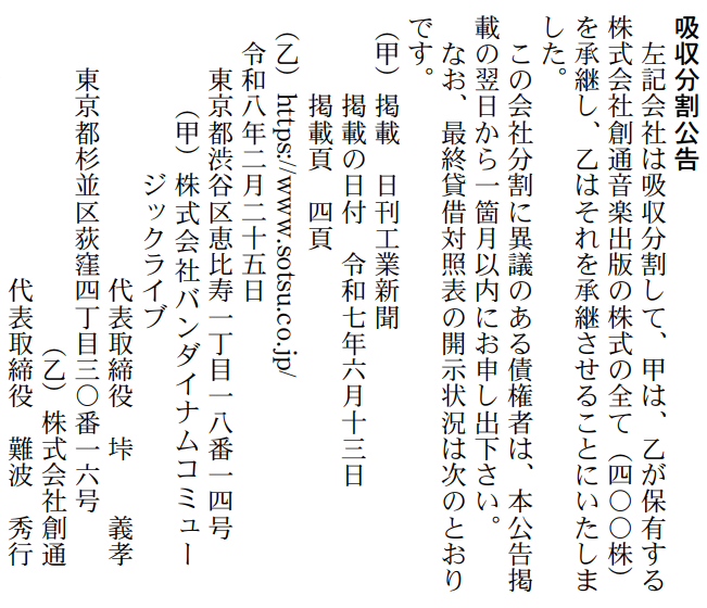 2月25日付の「官報」に本件に関する「吸収分割公告」が掲載されていた。