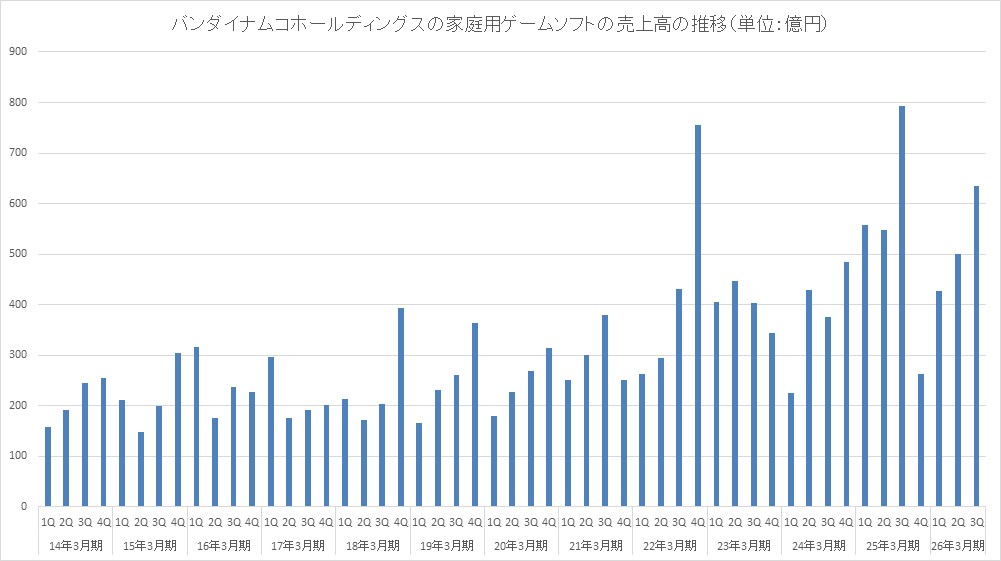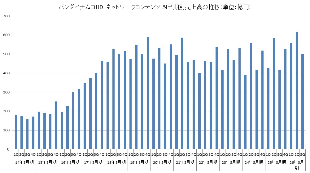 バンダイナムコホールディングス<7832>は、この日(2月5日)、第3四半期(2025年10~12月)におけるデジタル事業ネットワークコンテンツ(PCやスマホ向けのオンラインゲーム)の売上高について、前年同期比19.4%増の498億円だったと発表した。これで7四半期連続で前年同期比プラスを記録したことになる。