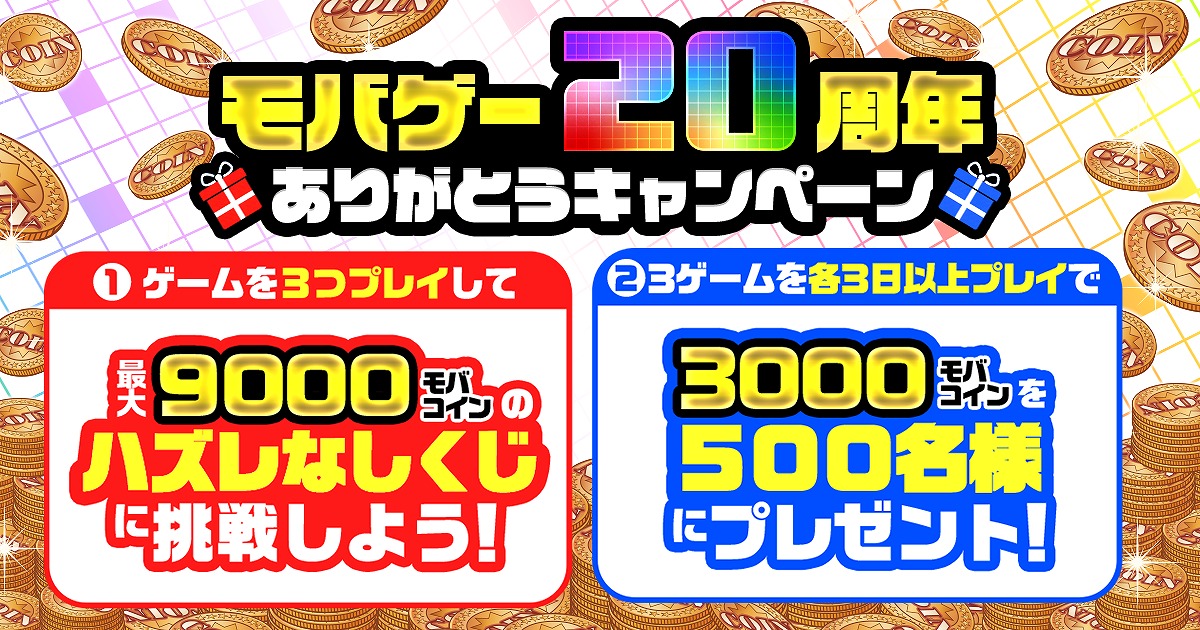 「モバゲー20周年ありがとうキャンペーン」と題してゲームを3タイトルプレイすると、最大9000モバコインがあたるハズレなしのくじびきにチャレンジできる企画と、3ゲームをそれぞれ累計3日以上プレイした人の中から抽選で500名に3000モバコインをプレゼントする企画を実施する。