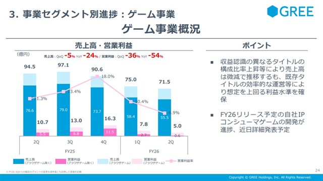 ゲーム事業の第2四半期期間(10~12月)は、売上高71億5000万円(前四半期比5%減、前年同期比24%減)、営業利益5億円(同36%減、同54%減)となった。