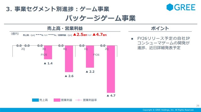 また、現時点ではまだ売上のないパッケージゲーム事業は開発費用が先行し、四半期ベースで4億7000万円の営業赤字を計上した。
