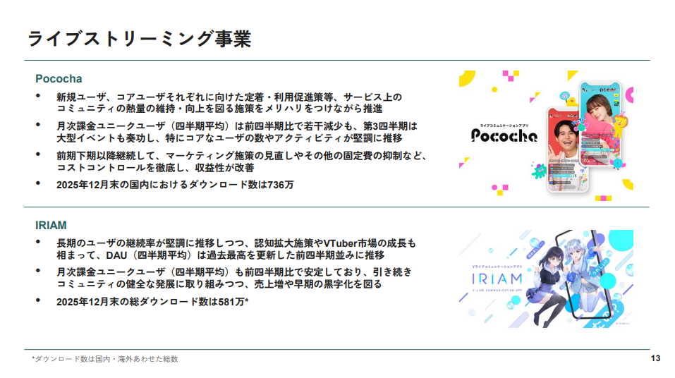 『Pococha(ポコチャ)』では、年末の大型イベントが奏功し、コアユーザー数やアクティビティが堅調に推移するとともに、 マーケティング施策の抜本的な見直しや固定費の抑制といった構造改革を行い、収益性の改善を行っているとのこと。