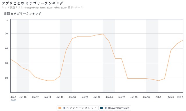 また、ライトフライヤースタジオとKeyの『ヘブンバーンズレッド』が前日の34位から29位へと順位を上げてきた。『ヘブバン』は、2⽉1⽇22時から「4th Anniversaryキャンペーン」を開始しており、その中で新⾐装の期間限定「SS<レゾナンス>七瀬七海」が登場した「期間限定 4th Anniversaryガチャ」を実施していることなどが足元の順位上昇につながっているもようだ。