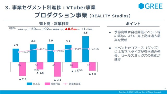 一方、REALITY Studiosのプロダクション事業は、季節商戦や自社開催イベントなどの寄与により、売上高が前四半期比で50%増、前年同期比で92%増と大きく成長した。