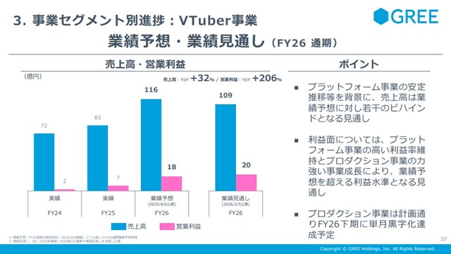 メタバース事業の2026年6月期通期の見通しについては、売上高は従来の業績予想に及ばない見通しだが、プラットフォーム事業の高い利益率維持とプロダクション事業の力強い事業成長により、営業利益は従来予想を上回る見通しだ。