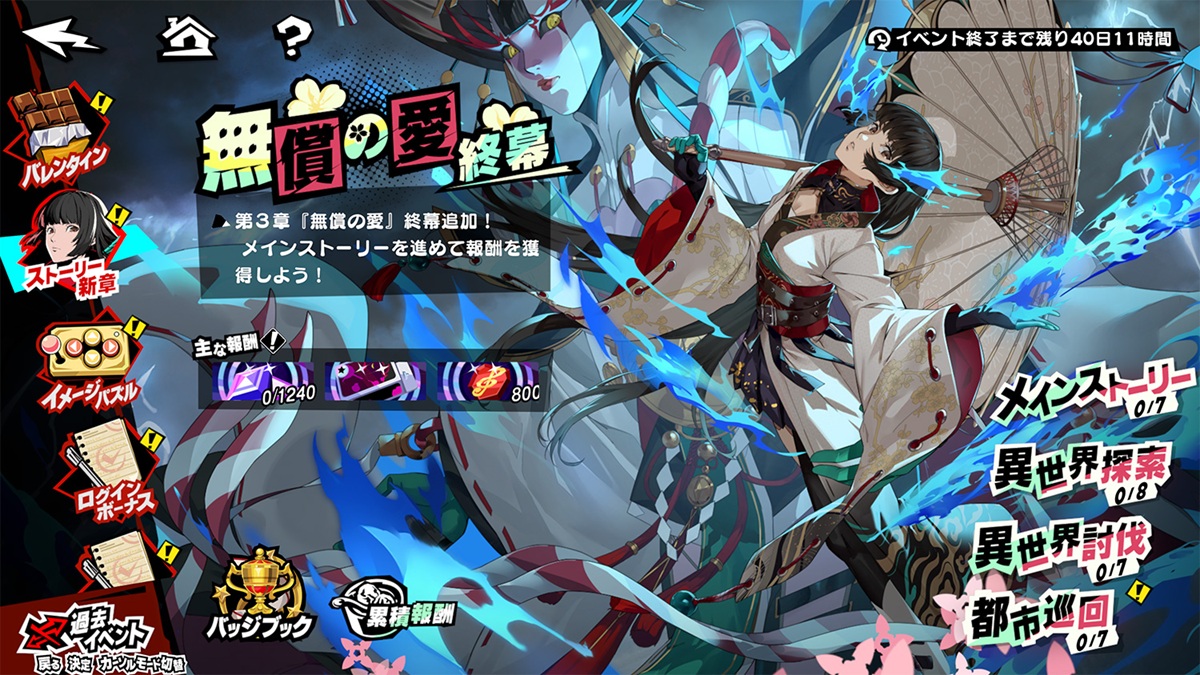 「無償の愛」終幕で追加されたコンテンツをプレイして目標を達成すると、契約(ガチャ)などに使用可能な「自在結晶」最大1,200個以上や、主人公の★5武器などと交換できる「喚喜のメダル」、イベント専用アイテム「梅花のしおり」が手に入る。「梅花のしおり」を集めると、ランクⅦのペルソナ「ジークフリード」や“イメジャリー”に使用するアイテム「星屑晶珠」などが獲得可能。