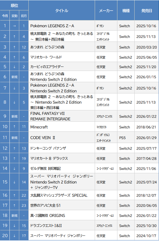 1月の新品ランキングでは、『Pokémon LEGENDS Z-A』が昨年秋の発売以来高い人気を維持し、12月に続き首位を獲得した。Switch2への移行期にありながらも、既存のSwitch主力タイトルが引き続き市場を牽引した結果である。