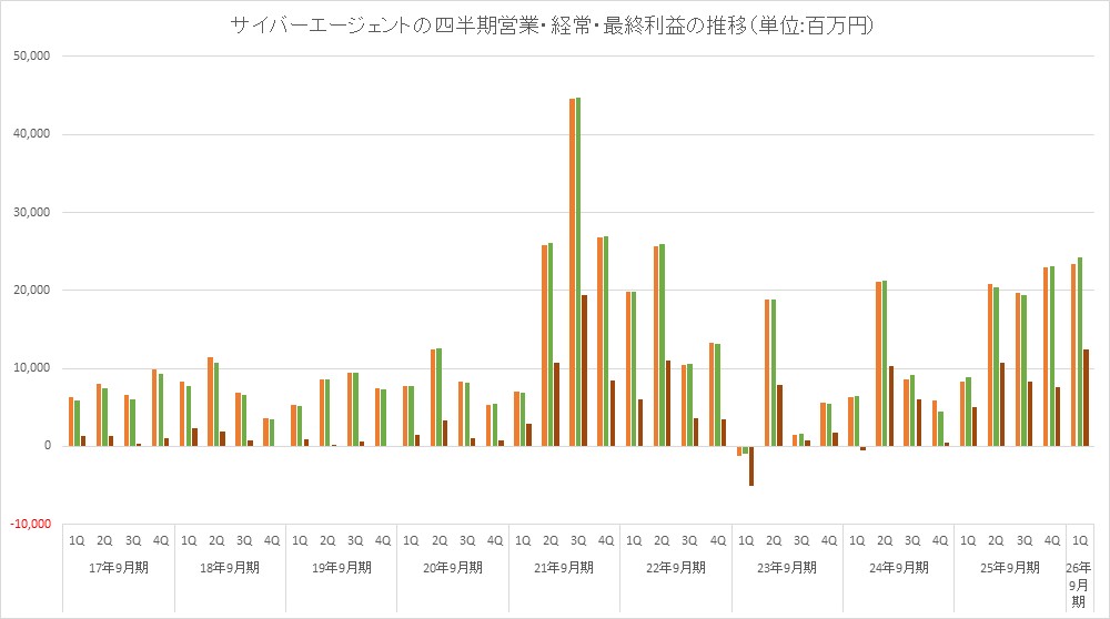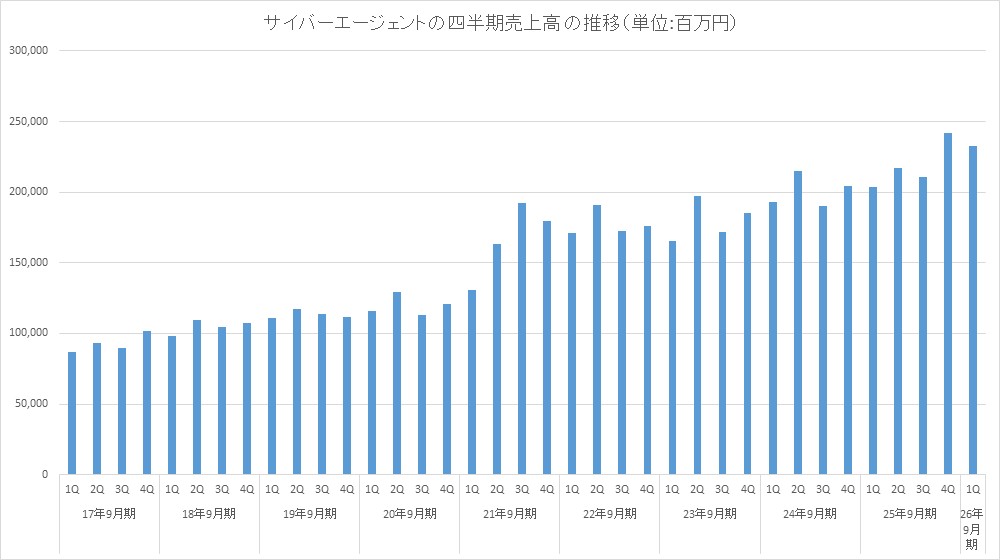 サイバーエージェント<4751>は、2月6日、2026年9月期 第1四半期の連結決算を発表し、売上高2323億7700万円(前年同期比14.0%増)、営業利益133億9500万円(同181.8%増)、経常利益242億1200万円(同174.9%増)、最終利益124億6200万円(同145.7%増)だった。