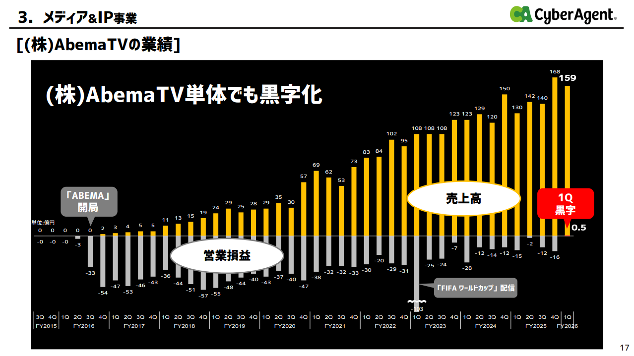 メディア&IP事業には、「ABEMA」、「WINTICKET」、アニメ&IP事業本部等が属しており、それらが重層的に売上を積み上げ、売上高は626億1700万円(同12.5%増)と好調に推移した。営業利益は積極的にコンテンツ投資をしつつも、AbemaTVの四半期営業黒字等が寄与し49億円(同246.1%増)と大幅な増益となった。これまでメディア&IP事業として黒字を達成しており、AbemaTV単体の黒字は悲願だった。