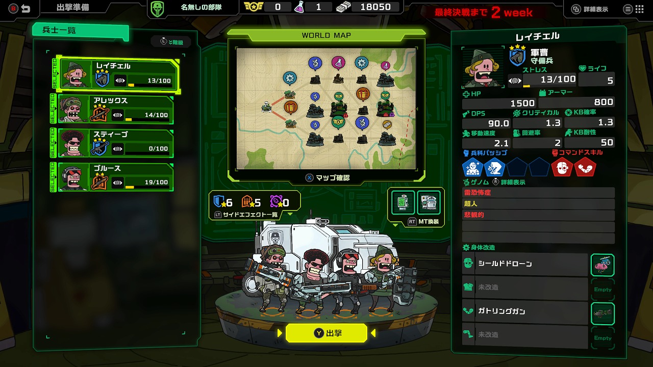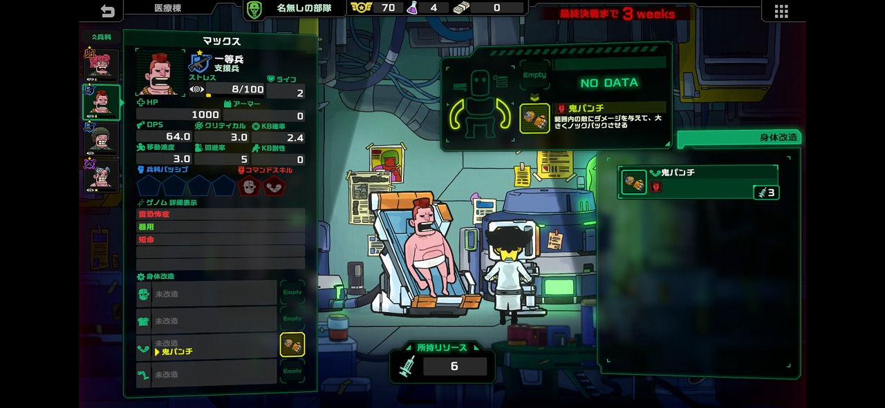 本作は「バトル×医療」の新感覚ドタバタ リアルタイムストラテジー。最強の部隊を4週間で作り上げ、最終決戦に挑みましょう! プレイヤーは指揮官となり、1週間サイクルで展開する「基地パート」と「戦闘パート」を往復しながら、4週間後の「ターミナルコア」破壊を目指す。基地では「治療・解剖・強化」によって兵士たちを徹底的にマネジメント。