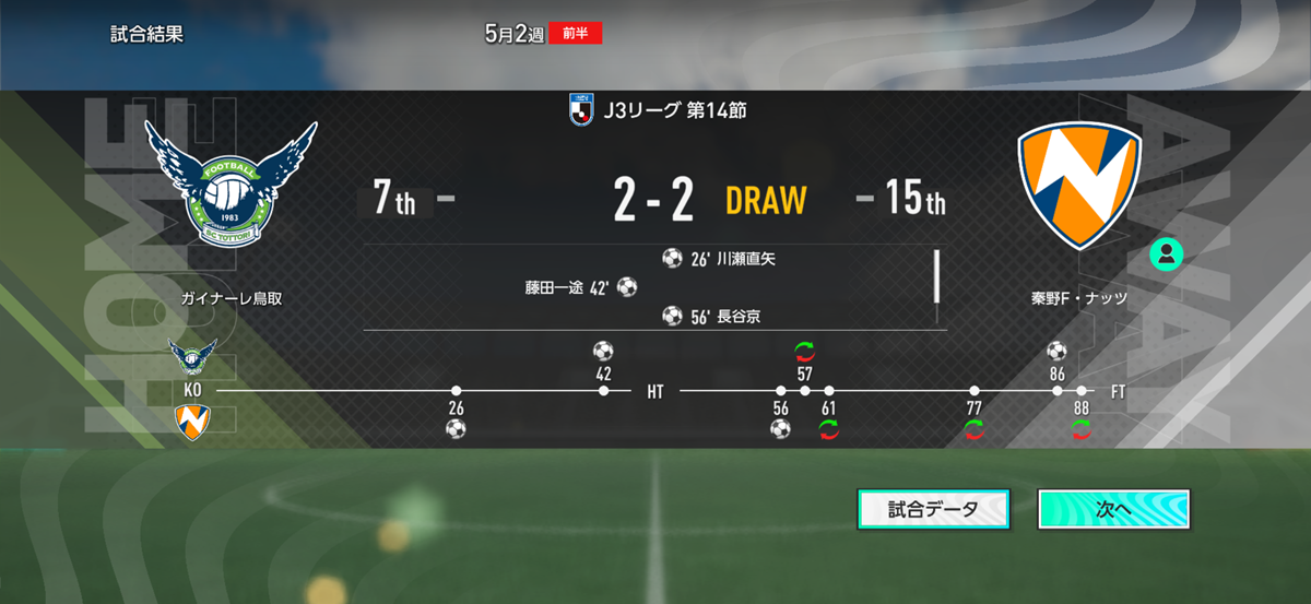 川瀬とハセキョーが得点するも、終盤86分に追いつかれてしまった。
