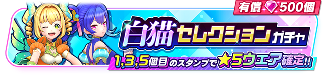 「モンストセレクションガチャ」からはネオ(CV:水瀬いのり)、オラゴン(CV:福島潤)の2キャラクター、「白猫セレクションガチャ」からソアラ(CV:新井里美)、ノア(CV:水瀬いのり)の2キャラクターが登場する。本ガチャから排出される★5ウェアは、上記のキャラクターのウェアのみとなっている。また、本ガチャは有償ジュエル500個限定で5回までまわすことができ、1回目、3回目、5回目のスタンプでは★5ウェアが確定となる。それぞれのキャラクターは限定ウェアも登場する。
