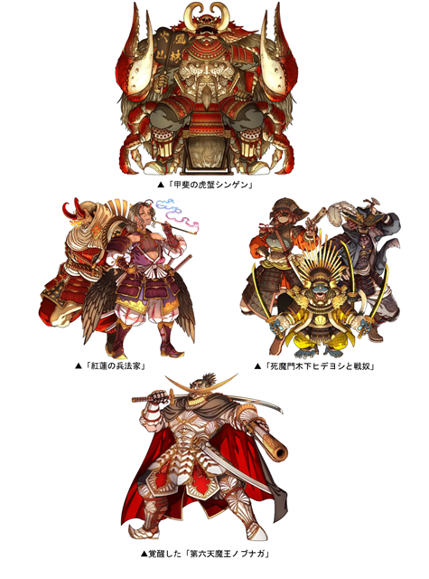 本ダンジョンには、新たに「甲斐の虎蟹シンゲン」「紅蓮の兵法家」「死魔門木下ヒデヨシと戦奴」、覚醒した「第六天魔王ノブナガ」が登場!また、クリアした回数に応じて竜石を手に入れることができる。
