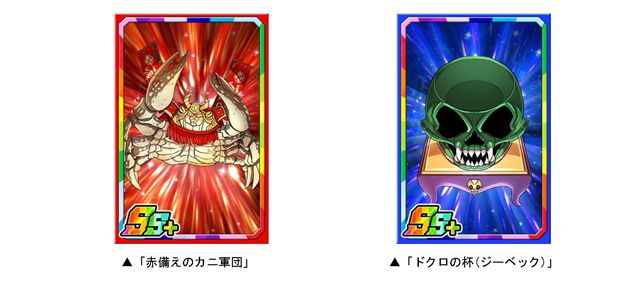 ダンジョンのボスモンスターを倒すと、まれに新たな限定カード「赤備えのカニ軍団」「ドクロの杯(ジーベック)」が手に入る。このカードは複数枚集めるとDRAへと進化させることができ、子分スキルの効果が強力になる。