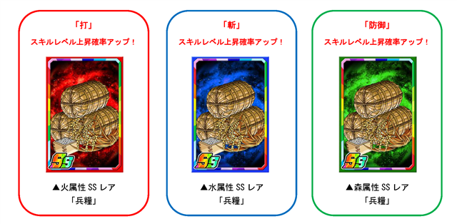 「戦国P」を使い素材ガチャを回すと、限定の強化素材「兵糧」を手に入れることができる。一部のモンスターに使うと強化値2倍の効果があるほか、打・斬・防御のスキルレベル上昇確率もアップする。