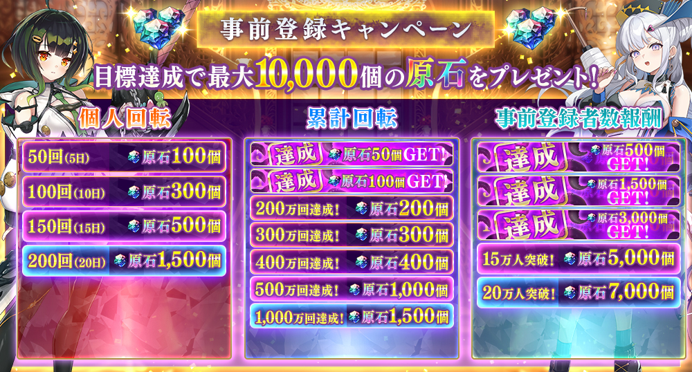 引き続き事前登録者数と累計回転、個人回転、それぞれの目標を達成することで、サービス開始時に最大10,000個の原石(ガチャ33回分)と事前登録ガチャで入手したお気に入りのキャラがもらえるキャンペーンを開催している。