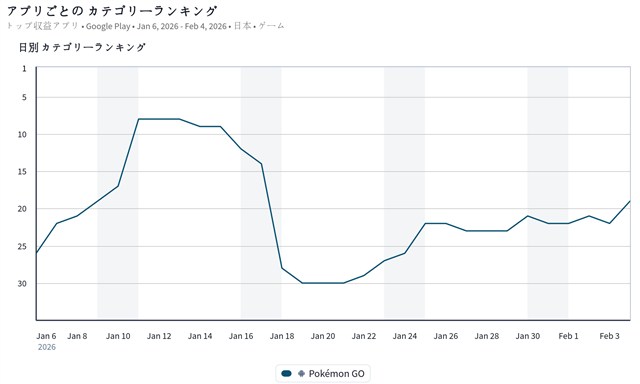 ランキングの動きで目立ったのは、前日の22位から19位に上昇し、トップ20圏内に浮上したNianticとポケモンの『ポケモンGO』だ。『ポケモンGO』は、シンクロポケモンの「カラミンゴ」が初登場した「カラミンゴカーニバル」を2月3日10時より開催中で、イベント限定の「タイムチャレンジ」が楽しめるようになる有料チケットを販売していることなどが売上に寄与しているようだ。