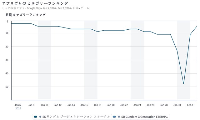 トップ10圏内では、バンダイナムコエンターテインメントの『SDガンダム ジージェネレーション エターナル』が前日の11位から5位に浮上してきた。『ジージェネエターナル』は、1月31日より、メインステージ「機動新世紀ガンダムX」(後半)を追加するとともに、UR「ガンダムDX(EX)」 /UR 「ガロード・ラン」やUR「ガンダムヴァサーゴチェストブレイク(EX)」/UR「シャギア・フロスト」などを新たに追加したピックアップガシャを開催していることが売上に貢献しているようだ。