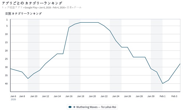 また、KURO GAMESの『鳴潮』が33位から28位に上昇し、上位をうかがう形となっている。『鳴潮』は、本日2月5日に大型アプデVer.3.1「雪に抱かれた君へ」を配信開始予定であり、アップデート後に星5共鳴者「エイメス」の登場する共鳴者集音(イベント)「春を背に、星は旅立つ」を開催予定であることから、ここからどこまで順位を上げてくることになるのか注目される。